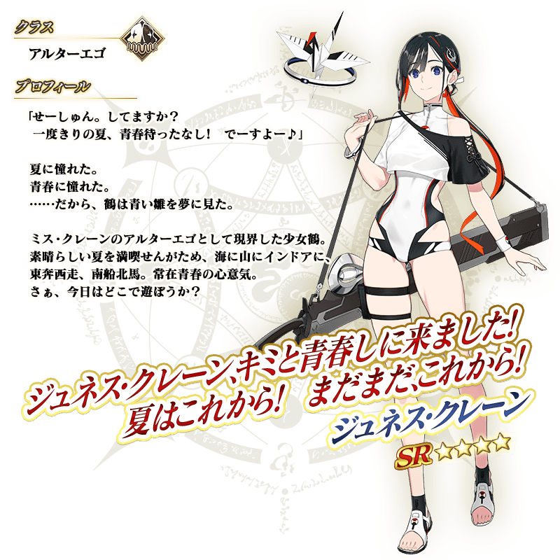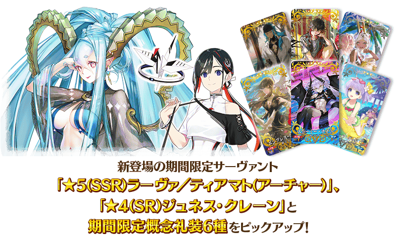 期間限定イベント「カルデア・U-サマーアイランド ~大統領は夏の夢を見るか?~」の開幕を記念して、新登場の期間限定サーヴァント「★5(SSR)ラーヴァ/ティアマト(アーチャー)」、「★4(SR)ジュネス・クレーン」と期間限定概念礼装6種をピックアップ!