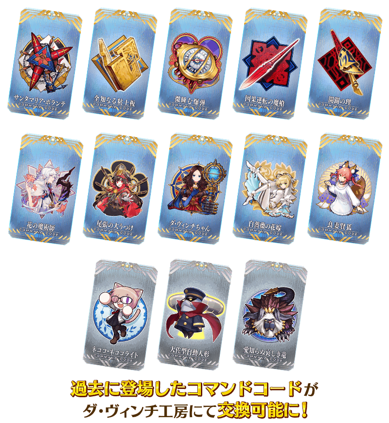 ダ・ヴィンチ工房の「マナプリズムを交換」「レアプリズムを交換」に、過去の期間限定イベントで登場した★5(SSR)コマンドコード5種を含む合計13種を恒常的に追加いたします!
