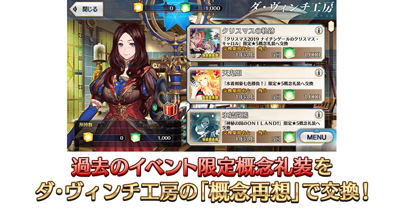 ダ・ヴィンチ工房の「レアプリズムを交換」に、過去に登場したマナプリズム交換限定概念礼装5種の開放権を恒常的に追加いたします!