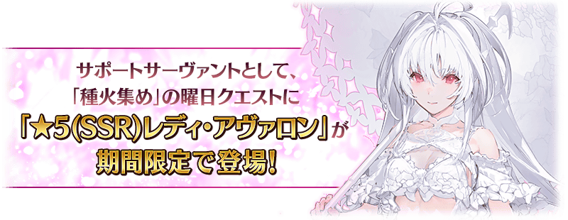 下記の期間中、期間限定で「種火集め」のクエストにサポートサーヴァントとして「★5(SSR)レディ・アヴァロン」が登場します!