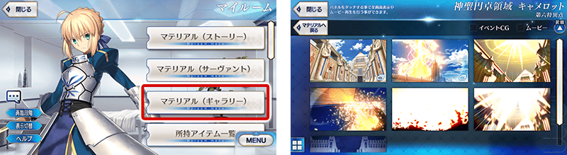 閲覧可能なイベントCGやムービーは、対象のメインストーリー、メイン・インタールードを進めることで、「マテリアル(ギャラリー)」に追加されていきます。