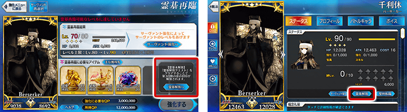 ボタンをタッチすることで各画面からサーヴァントの霊基解放クエストまで直接遷移することができます。
