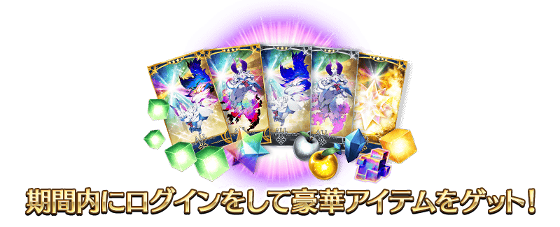 下記期間中に10回ログイン(1日1回カウント)すると、レアプリズム1個、伝承結晶1個、聖晶石30個(聖晶石召喚最大11回分)など豪華報酬をプレゼント!
