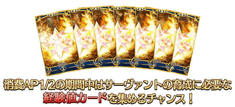 下記の期間中、期間限定でカルデアゲート内に日ごとに出現する「種火集め」の消費APが1/2となります!(バトルにおいて撤退した場合でも、同様の消費量になります)