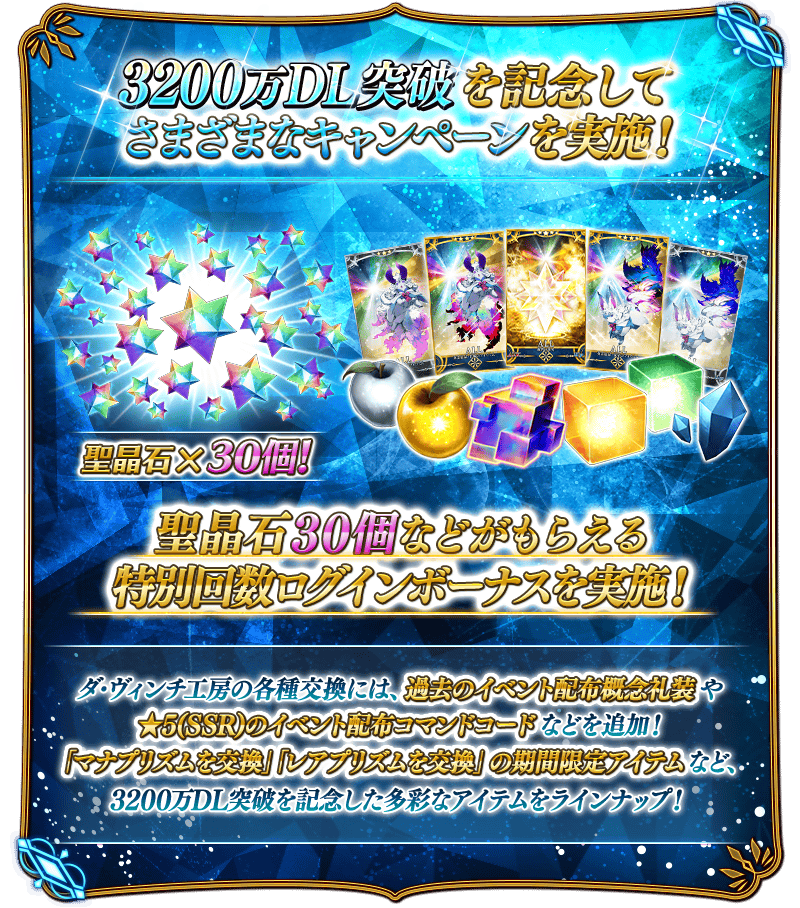 下記期間中に10回ログイン(1日1回カウント)すると、レアプリズム1個、伝承結晶1個、聖晶石30個(聖晶石召喚最大11回分)など豪華報酬をプレゼント!