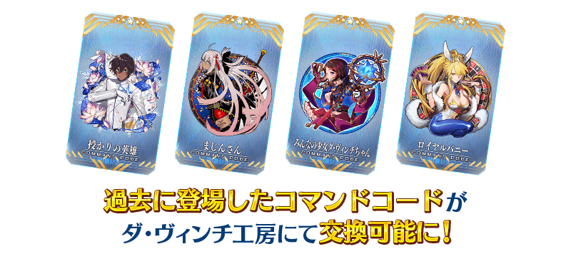 ダ・ヴィンチ工房の「レアプリズムを交換」に、過去の期間限定イベントで登場した★5(SSR)コマンドコード4種を恒常的に追加いたします!