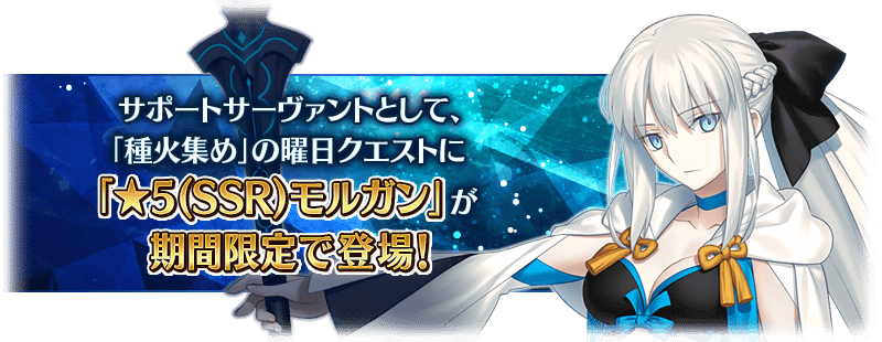 下記の期間中、期間限定で「種火集め」のクエストにサポートサーヴァントとして「★5(SSR)モルガン」が登場します!