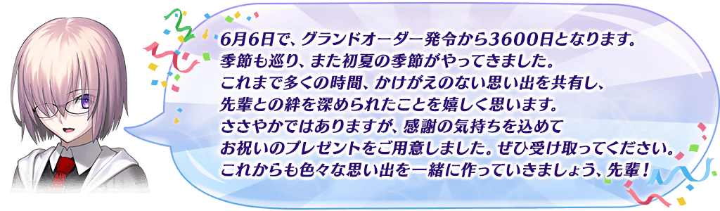 ※キャンペーン開始までに「特異点F 炎上汚染都市 冬木」をクリアしていない場合、クリアすることで受け取ることができます。 ※上記時間までに、ターミナル画面にあるクエストボードに「CLEAR」の文字が表示されている必要があります。 ※期間内にログインできなかった場合には受け取ることができません。 ※プレゼントは、1回のみの受け取りになります。