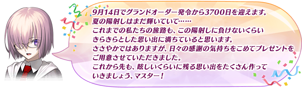 2025年9月14日(日) 23:59までに「特異点F 炎上汚染都市 冬木」をクリアしているマスターが対象
