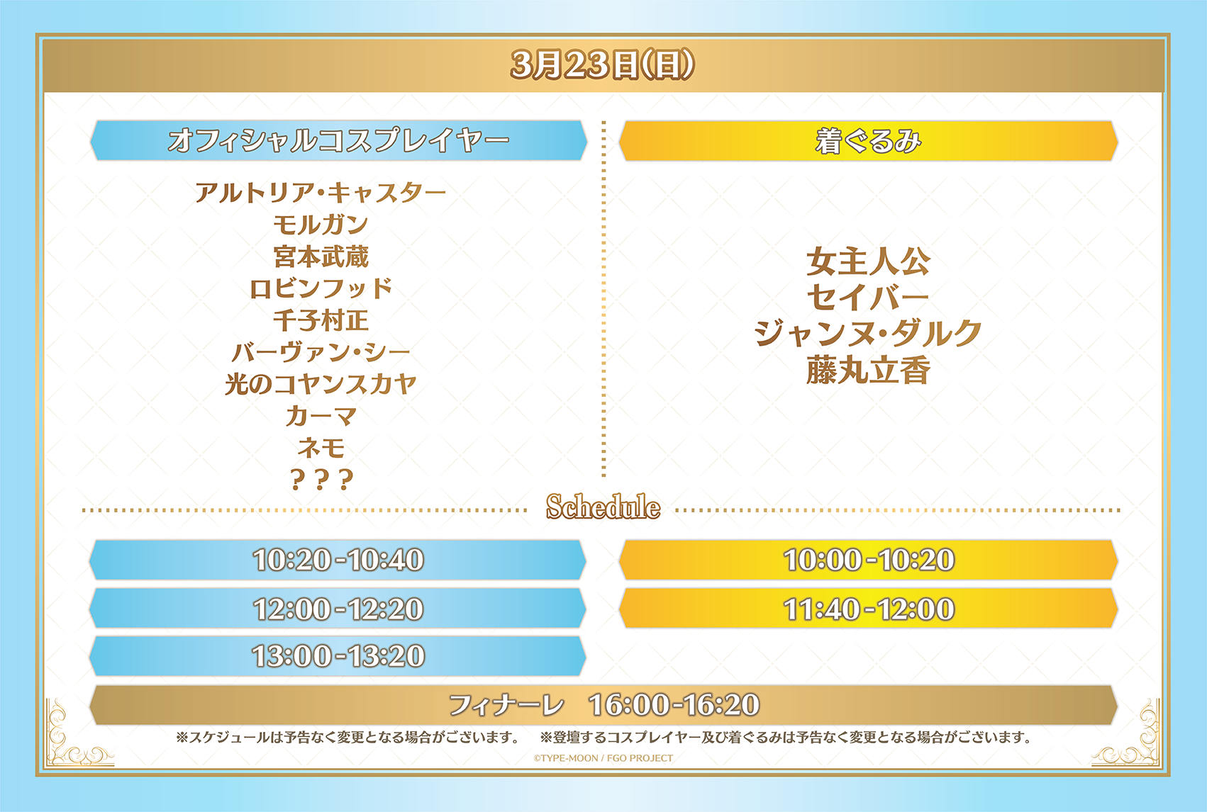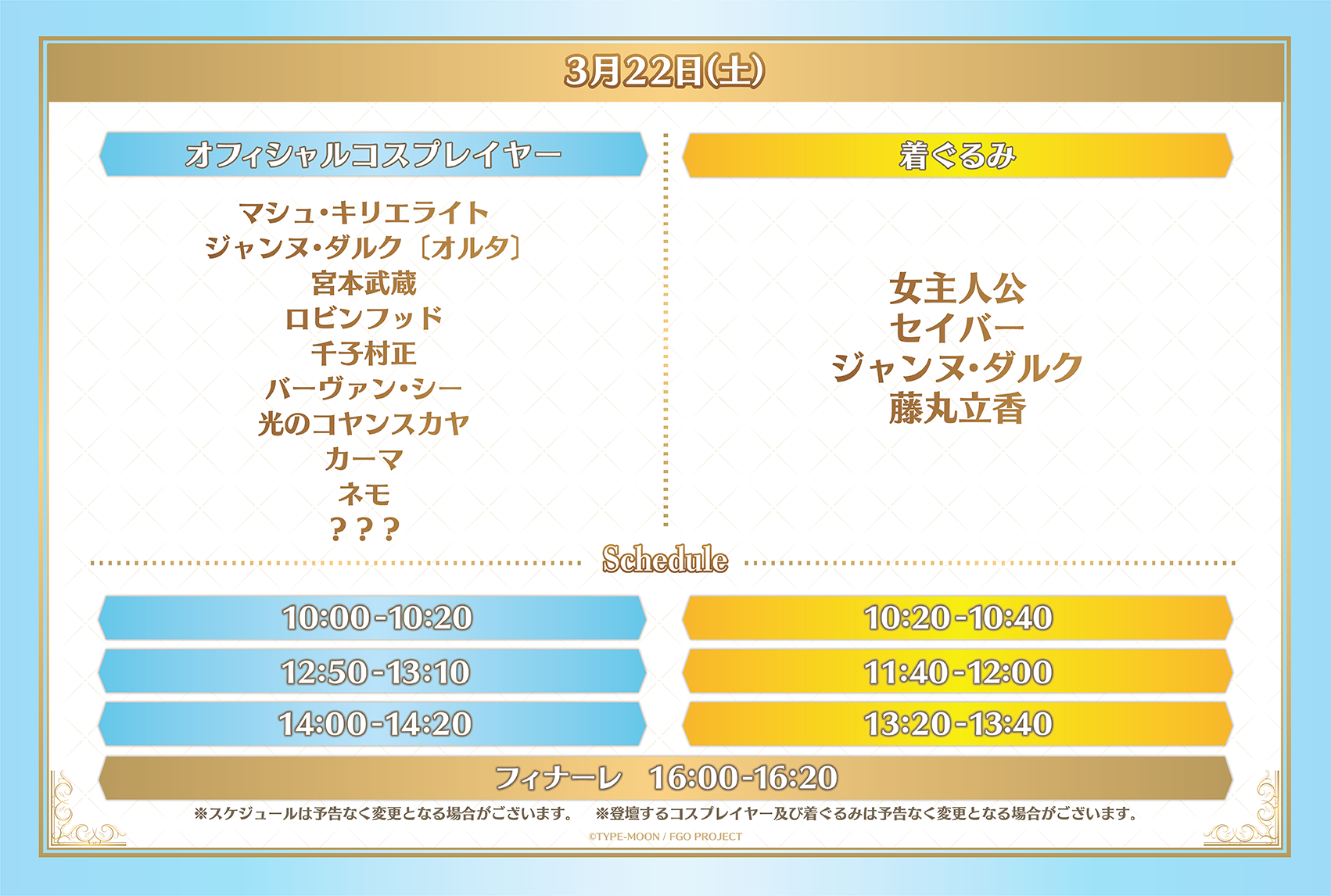 FGOブース内のステージ配信はYouTube「【FGO公式】くらぶカルデア」(FGO公式サブチャンネル)およびYouTube「【公式】Fate/Grand Order チャンネル」にて生配信することに変更いたしました。