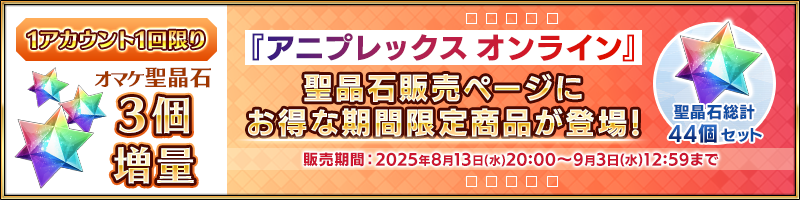 2025年8月13日(水) より期間限定で、『アニプレックス オンライン』聖晶石販売ページにて1アカウント1回限り購入可能なお得な商品を販売いたします。