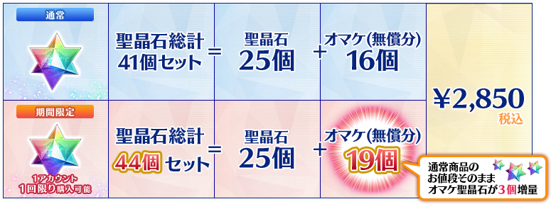 本商品は既存の聖晶石41個セットのお値段そのまま、オマケの聖晶石が3個増量されます。