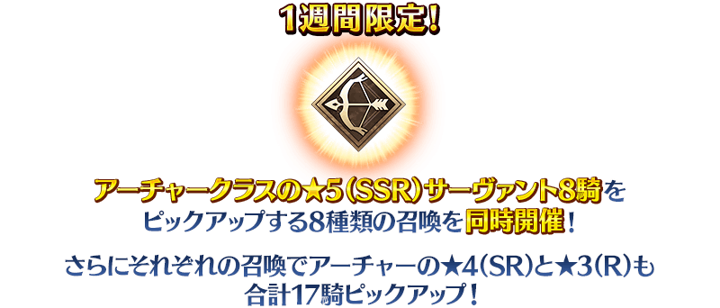 アーチャークラスのサーヴァントの中から期間限定サーヴァントを含む25騎のサーヴァントをピックアップする8種類の召喚を同時開催いたします!