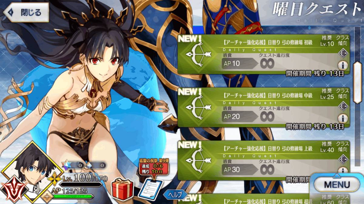 期間限定で、カルデアゲート内に曜日ごとに出現するアーチャーのクラスの「修練場」を期間限定で全種開放いたします。