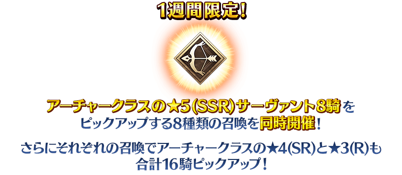 アーチャークラスのサーヴァントの中から期間限定サーヴァントを含む24騎のサーヴァントをピックアップする8種類の召喚を同時開催いたします!
