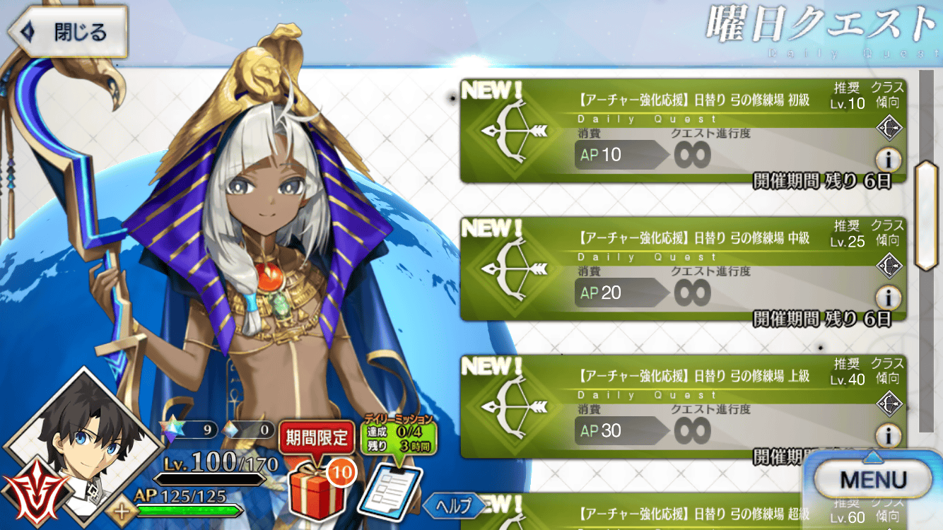 期間限定で、カルデアゲート内に曜日ごとに出現するアーチャーのクラスの「修練場」を期間限定で全種開放いたします。