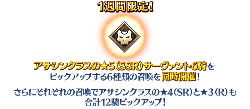 アサシンクラスのサーヴァントの中から期間限定サーヴァントを含む18騎のサーヴァントをピックアップする6種類の召喚を同時開催いたします!