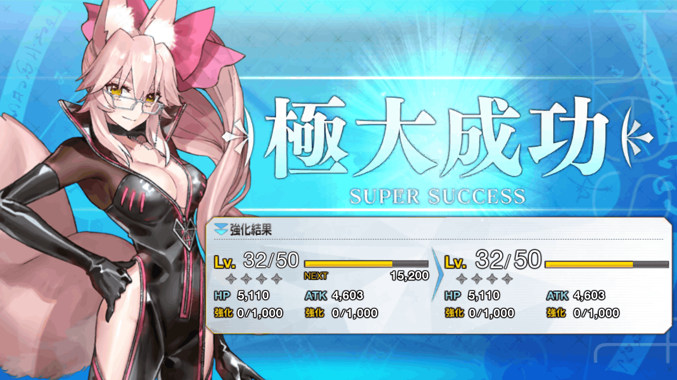 ※現在開催している他キャンペーンにて、「すべてのサーヴァントの強化をおこなった際の大成功・極大成功の発生率が2倍」を実施しておりますが、各キャンペーンで「強化大成功・極大成功率2倍」の対象となっている場合でも効果は重ならず、強化大成功・極大成功率は2倍となります。