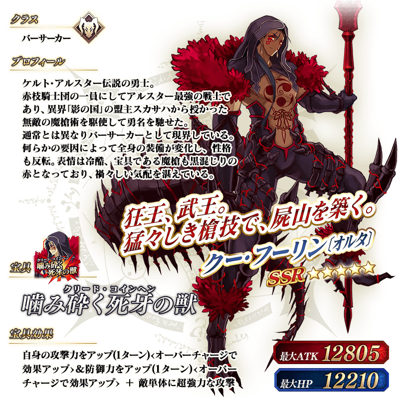 ※上記の「★5(SSR)クー・フーリン〔オルタ〕」のイラストは霊基再臨第2段階のものです。