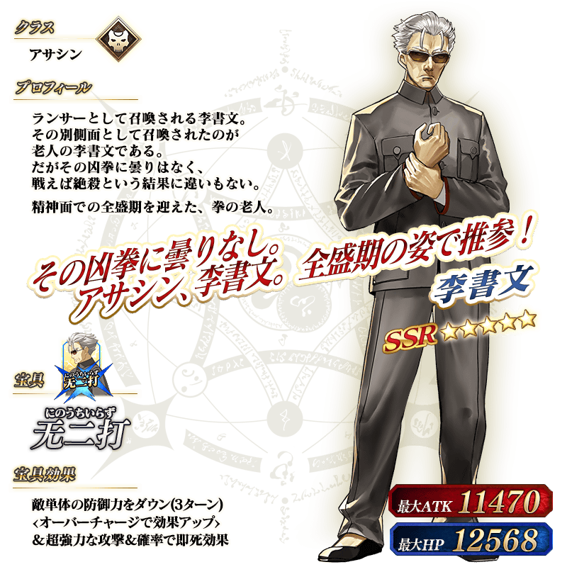 ※上記の「★5(SSR)李書文(アサシン)」のイラストは霊基再臨第2段階のものです。