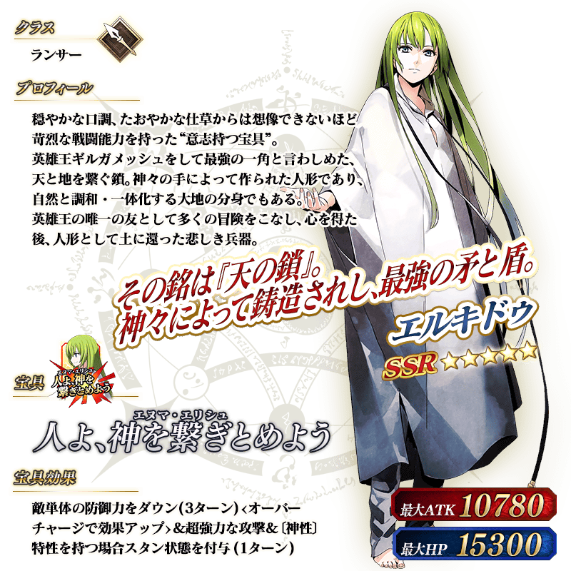 ※上記の「★5(SSR)エルキドゥ」のイラストは霊基再臨第2段階のものです。
