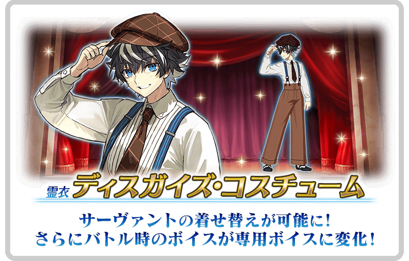 ※「霊衣縫製」に追加される霊衣「ディスガイズ・コスチューム」の開放権は恒常となり、交換期限はありません。 ※すでに交換対象の霊衣開放権を取得されている方については、交換することができません。 ※「★5(SSR)シャルルマーニュ」の霊衣は、外見とともに一部ボイスが変化します。 ※「★5(SSR)シャルルマーニュ」を未所持の場合、霊衣開放権の入手はできますが、霊衣開放はおこなえませんのでご注意ください。