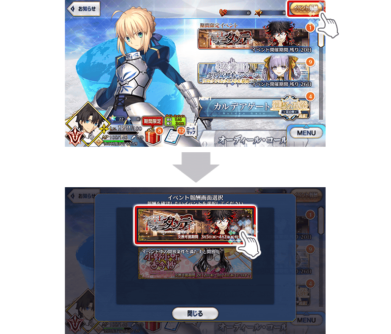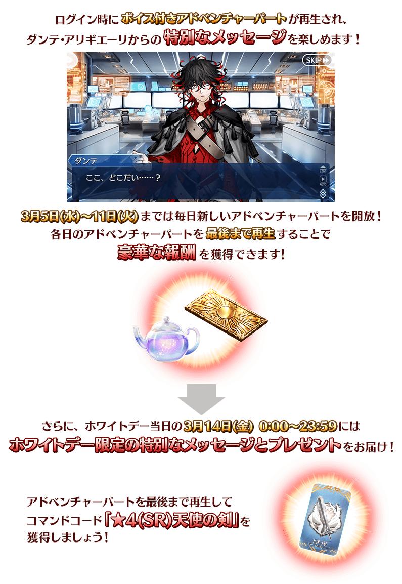 3月5日(水) 20:00~3月14日(金) 23:59までに実施されるダンテ・アリギエーリからのボイス付きアドベンチャーパートでは、アドベンチャーパートの再生が終わった後に報酬を受け取ることができます。