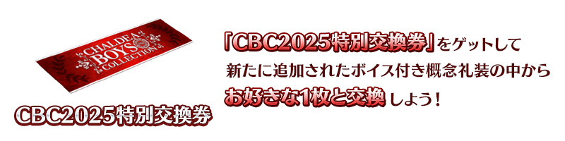 ※交換後の概念礼装はプレゼントボックスに送られ、「CBC2025特別交換券」は消滅します。 ※交換していない場合でも、概念礼装交換期間終了後に「CBC2025特別交換券」は消滅しますのでご注意ください。