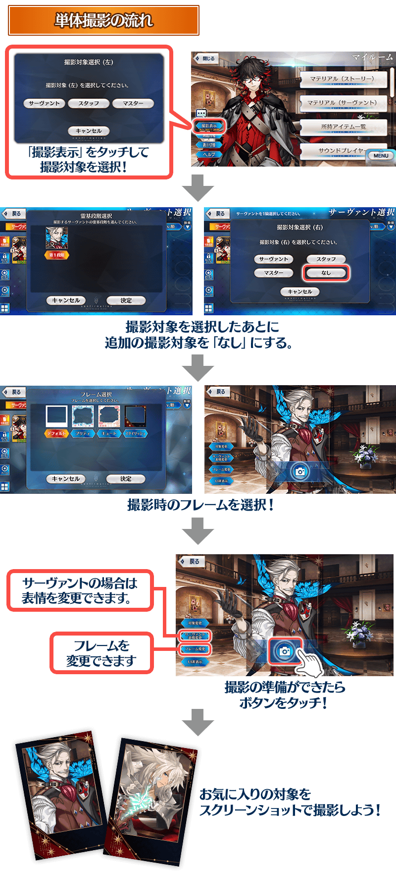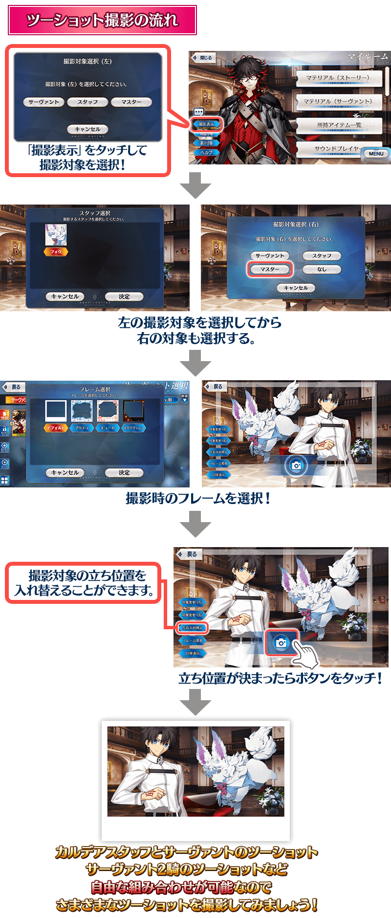 撮影対象はサーヴァント、カルデアスタッフ、マスターとなり、単体またはツーショットでの撮影をおこなえます。