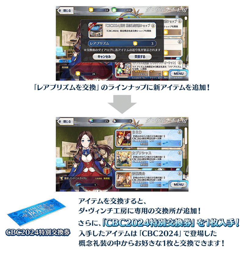 該当のアイテムをレアプリズムと交換すると、ダ・ヴィンチ工房に専用の交換ショップが開放されるほか、「CBC2024特別交換券」1枚がプレゼントボックスに送られます。