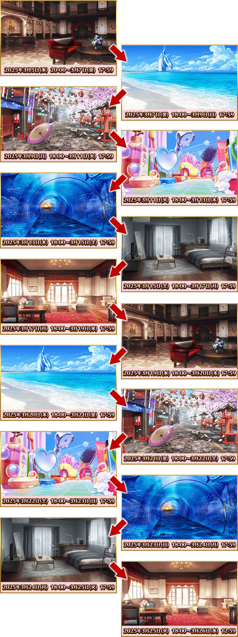 ※各ログイン日時の期間内でログインできなかった場合には、その日のメッセージを聞くことができません。 ※本キャンペーンのボイス付きアドベンチャーパートは、下記の日時で切り替わります。日によって、切り替わり時間が異なりますのでご注意ください。 ・3月5日(水) 20:00~3月6日(木) 17:59まで ・3月6日(木)~11日(火)は、18:00~翌日の17:59まで ・3月14日(金) 0:00~23:59まで