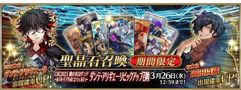 その他にも、期間限定「CBC2025 彼の名はダンテ ~ホテル・デノヴォのコンシェルジュ~ ダンテ・アリギエーリピックアップ召喚」などの情報を公開中!