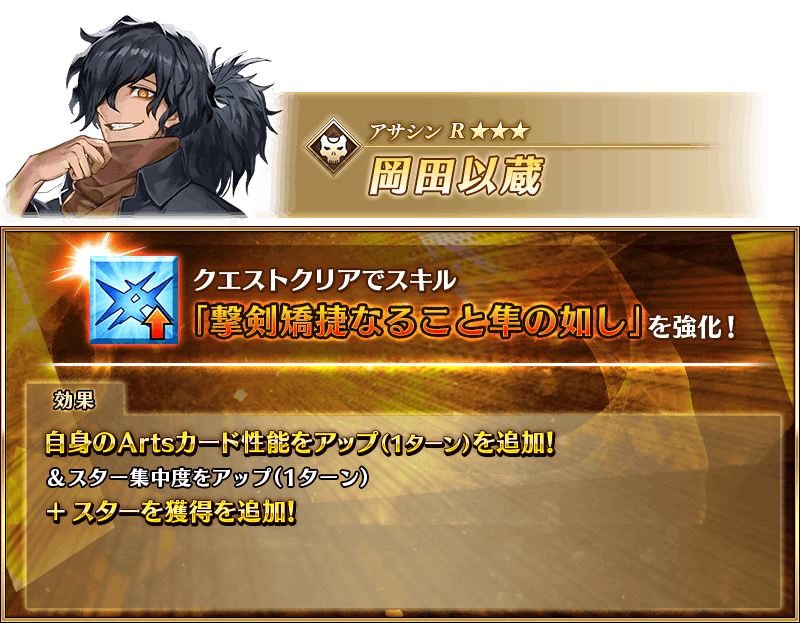 「★3(R)岡田以蔵」が強化される特別なクエスト「サーヴァント強化クエスト」が、カルデアゲートに恒常的に追加されます。