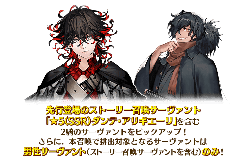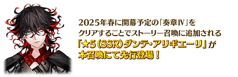 ※本召喚の排出対象となる「★5(SSR)ダンテ・アリギエーリ」は、ピックアップ期間終了時点ではストーリー召喚からは排出されません。2025年春に開幕予定の「奏章Ⅳ」をクリアすることでストーリー召喚にて排出されるようになります。