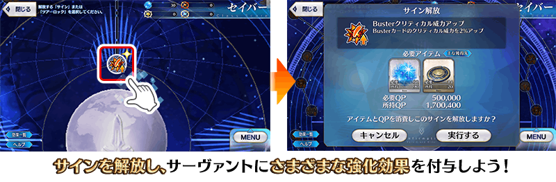強化したいクラスの「サイン」を解放することで対象クラスのすべてのサーヴァントにさまざまな強化効果を付与することができます!
