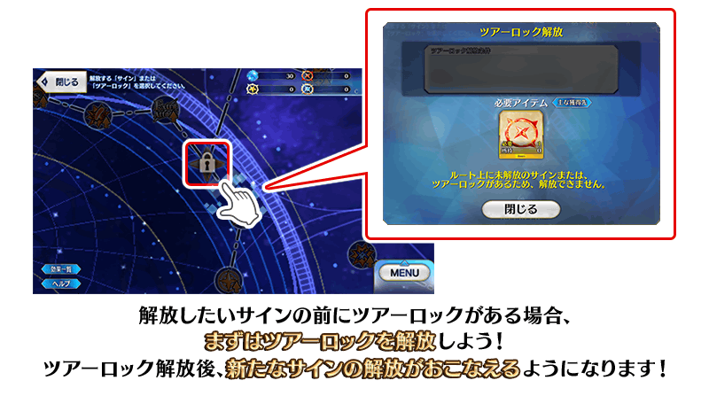 なお、サインは自由に選んで解放できるわけではなく、中央のクラスシンボルまたは解放済みのサインとルートで繋がったサインのみが解放可能です。