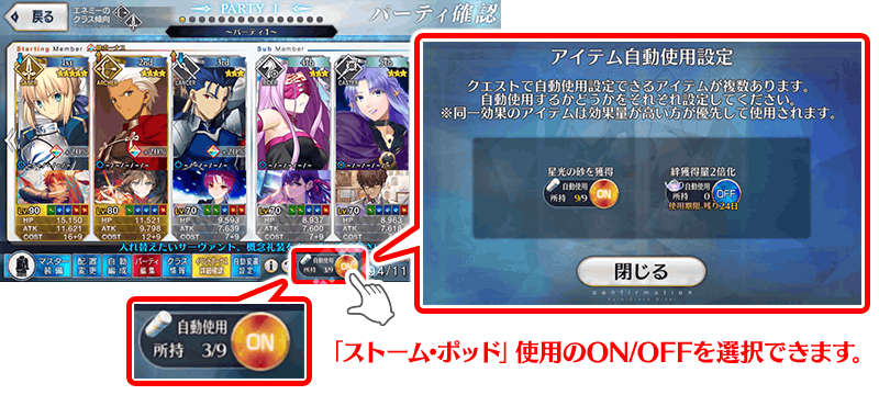 ※バトルを撤退および敗北した場合、「ストーム・ポッド」は消費されません。 ※白紙化地球上のフリークエスト以外で「ストーム・ポッド」を使用した際の効果は「星光の砂」を追加で獲得できることのみとなり、獲得できるマスターEXPや絆などに影響はありません。