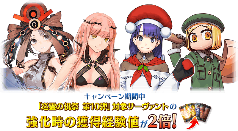 下記の期間中、「巡霊の祝祭 第10弾」関連サーヴァントの強化をおこなった際に、期間限定で獲得経験値が2倍になります!