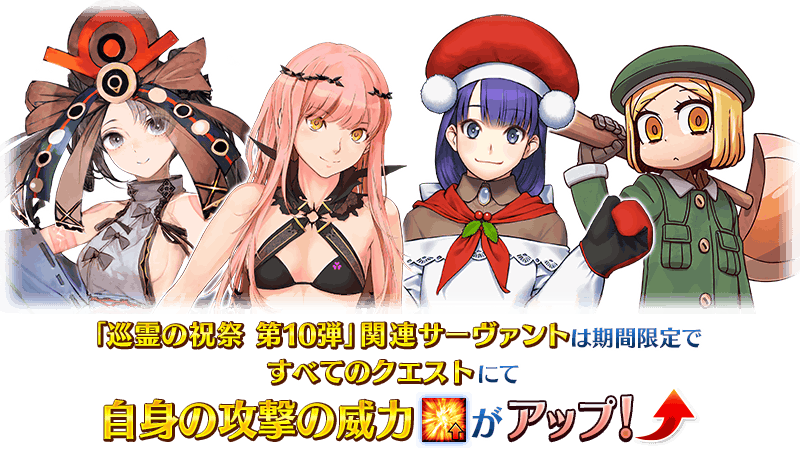 「巡霊の祝祭 第10弾」関連サーヴァントは、期間中にすべてのクエストにおいて、自身の攻撃の威力アップのボーナスが得られます!