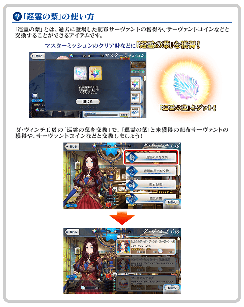 ※「巡霊の葉を交換」にて獲得できる「★4(SR)レオナルド・ダ・ヴィンチ(ルーラー)」「★4(SR)セタンタ」「★4(SR)宮本伊織」および宝具強化専用霊基、霊基再臨素材、サーヴァントコインは恒常の追加となり、獲得・交換に期限はありません。 ※獲得した配布サーヴァントはプレゼントボックスに送られ、プレゼントボックスより受け取ることで入手することができます。 ※過去に開催された期間限定イベントにおいて、対象サーヴァントが仮加入のみで正式加入していなかった場合、「巡霊の葉」で獲得した際に離脱前の強化状態は引き継がれず、初期状態での加入となります。 ※対象のサーヴァントを入手していない場合、宝具強化専用霊基、霊基再臨素材、サーヴァントコインを獲得することはできません。 ※「巡霊の葉を交換」で「累計で6騎目以降」の配布サーヴァントを獲得しても、レアプリズムは入手できません。