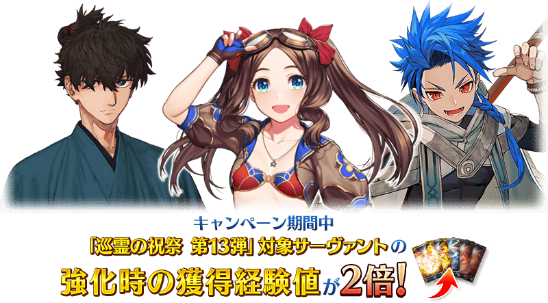 下記の期間中、「巡霊の祝祭 第13弾」関連サーヴァントの強化をおこなった際に、期間限定で獲得経験値が2倍になります!