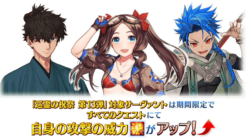 「巡霊の祝祭 第13弾」関連サーヴァントは、期間中にすべてのクエストにおいて、自身の攻撃の威力アップのボーナスが得られます!
