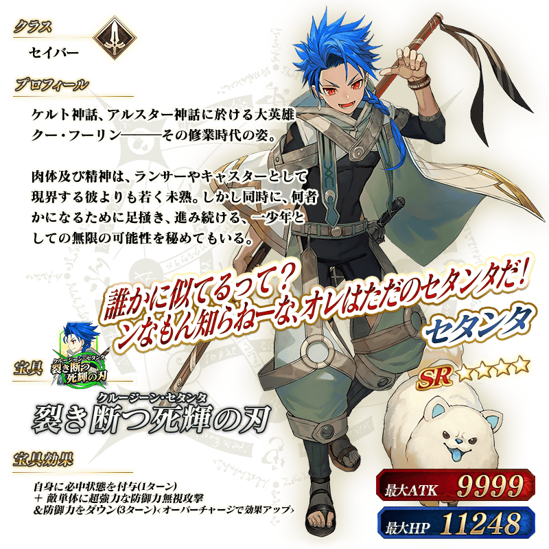 下記の期間中、期間限定で「★4(SR)セタンタ」の「強化クエスト」の消費APが1/2になります!(バトルにおいて撤退した場合でも、同様の消費量になります)