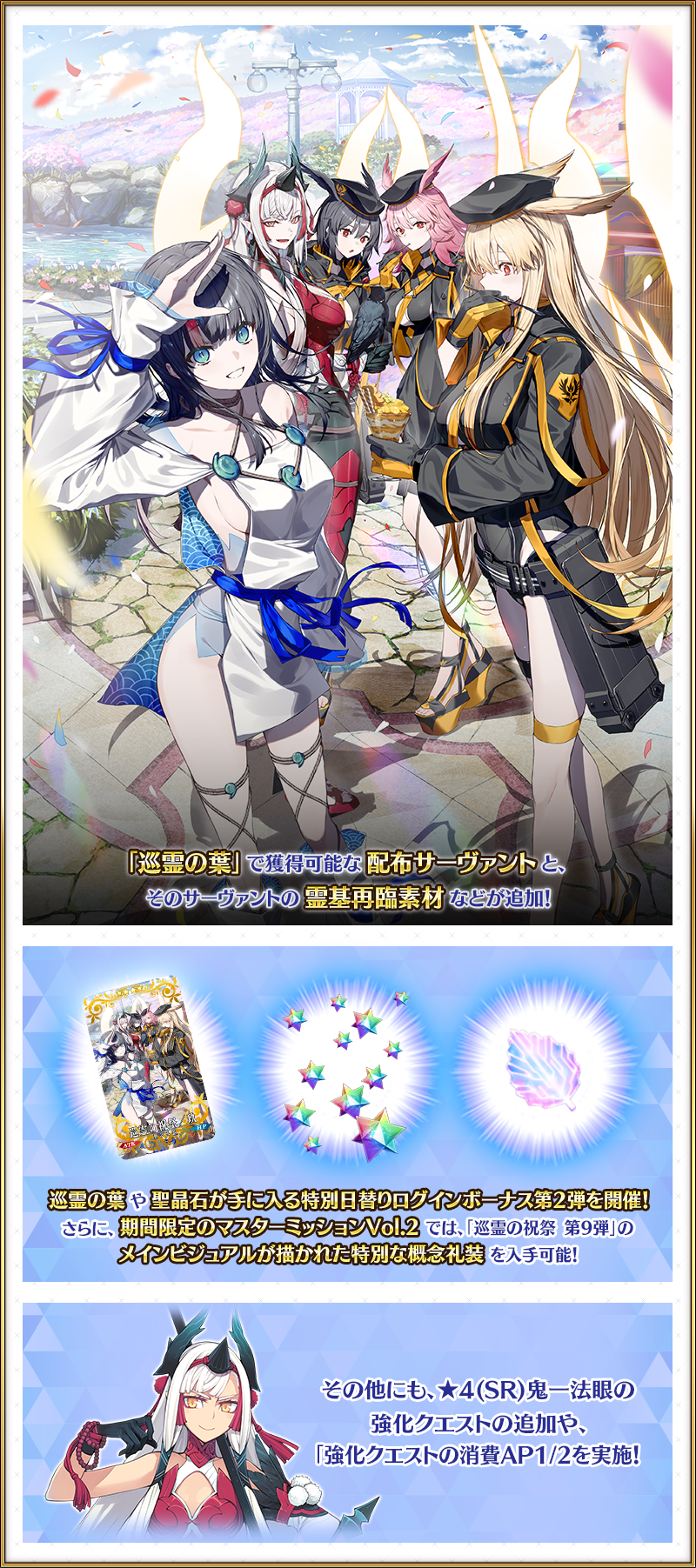 追加された配布サーヴァントの獲得に必要な「巡霊の葉」を入手できる特別日替りログインボーナスや期間限定のマスターミッションをはじめとした、さまざまな施策を実施いたします!