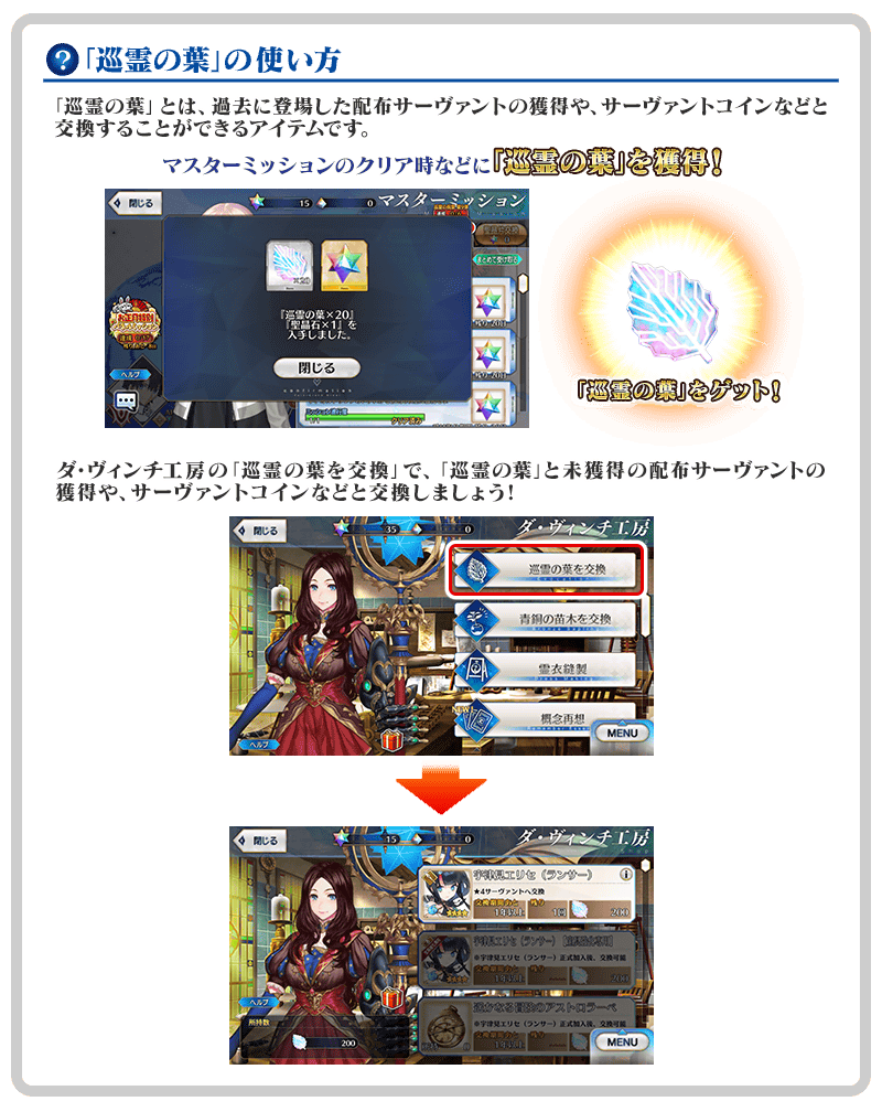 ※「巡霊の葉を交換」にて獲得できる「★4(SR)宇津見エリセ(ランサー)」「★4(SR)鬼一法眼」「★4(SR)スルーズ」「★4(SR)ヒルド」「★4(SR)オルトリンデ」および宝具強化専用霊基、霊基再臨素材、サーヴァントコインは恒常の追加となり、獲得・交換に期限はありません。