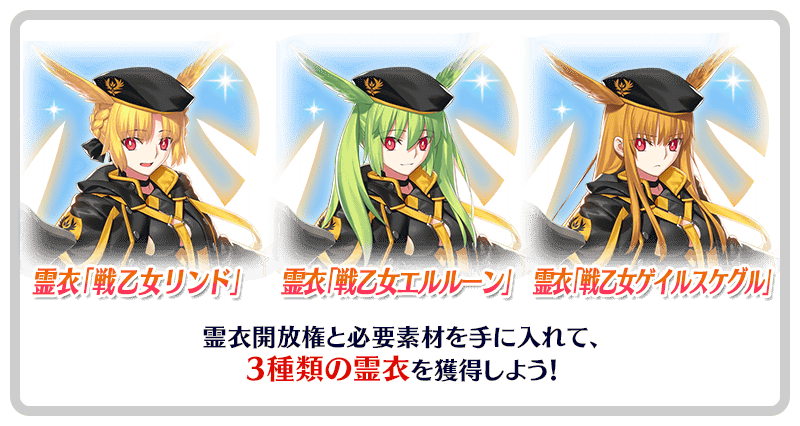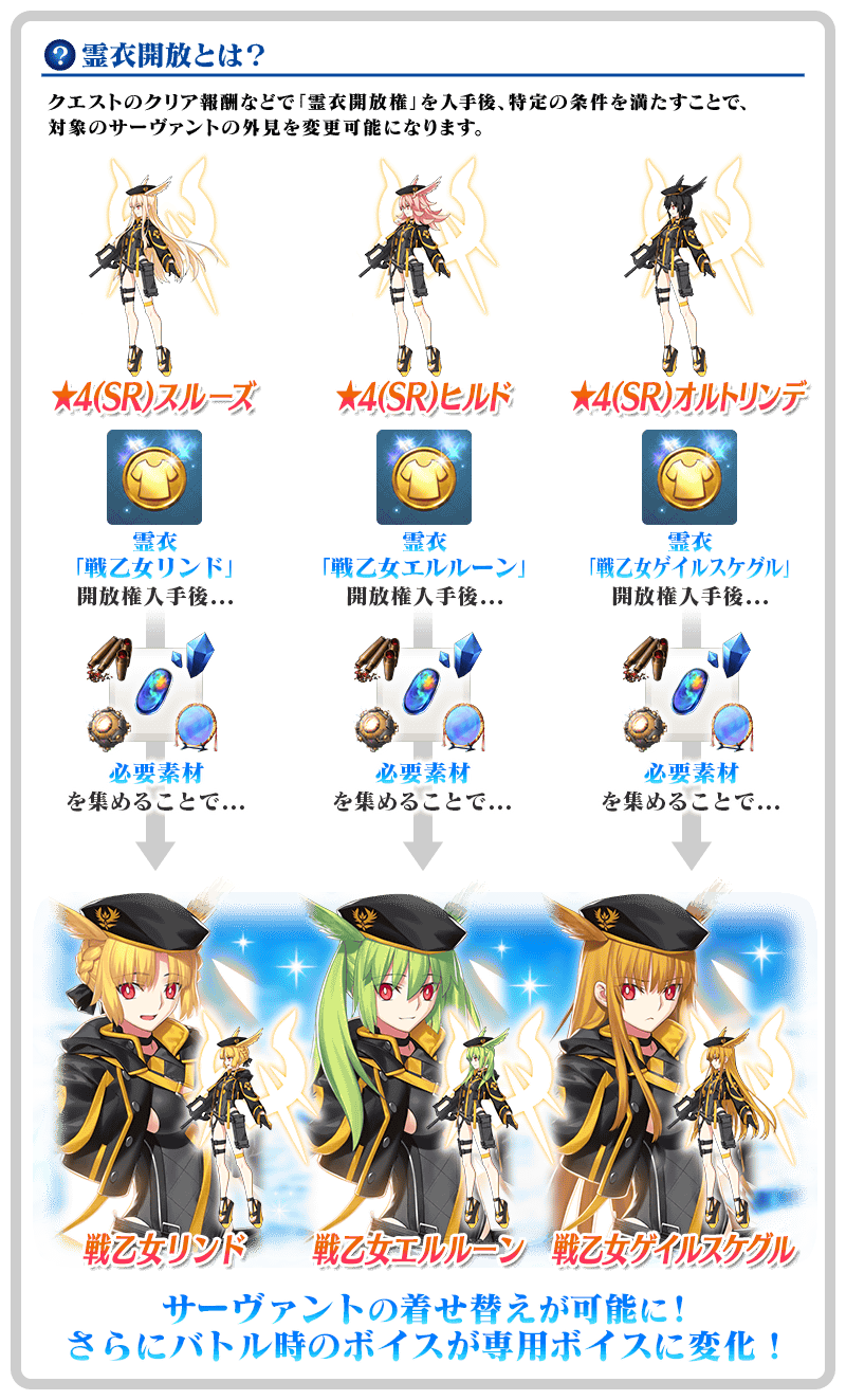 ※今回追加される「★4(SR)スルーズ」「★4(SR)ヒルド」「★4(SR)オルトリンデ」の霊衣は、外見とともに一部ボイスが変化します。