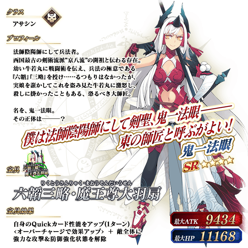下記の期間中、期間限定で「★4(SR)鬼一法眼」の「強化クエスト」の消費APが1/2になります!(バトルにおいて撤退した場合でも、同様の消費量になります)
