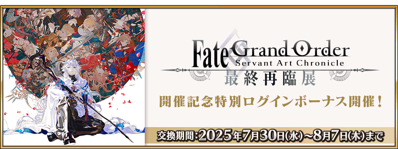 2025年7月30日(水) から開催している「Fate/Grand Order Servant Art Chronicle -最終再臨展-」を記念して、期間限定のログインボーナスとして、「Fate/Grand Order Servant Art Chronicle -最終再臨展-」のキービジュアルを使用した描き下ろしの特別概念礼装をプレゼント!