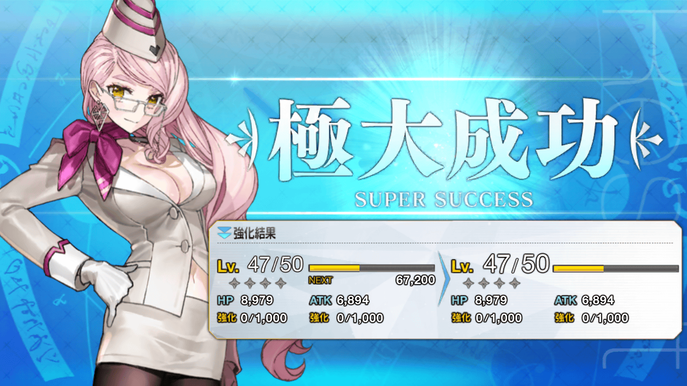 ※現在開催している他キャンペーンにて、「すべてのサーヴァントの強化をおこなった際の大成功・極大成功の発生率が2倍」を実施しておりますが、各キャンペーンで「強化大成功・極大成功率2倍」の対象となっている場合でも効果は重ならず、強化大成功・極大成功率は2倍となります。