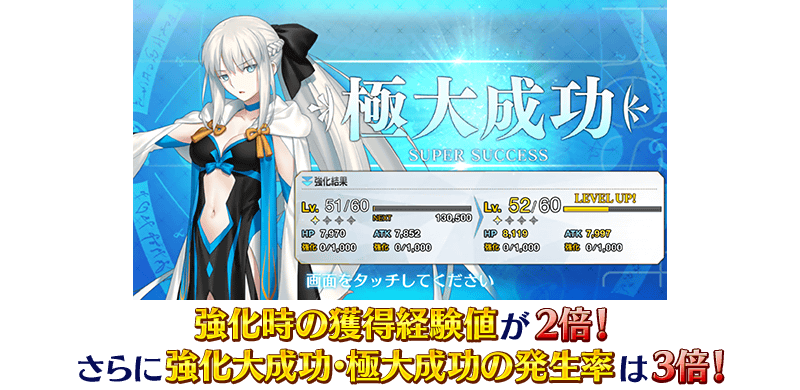 さらに、大成功(経験値2倍ボーナス)・極大成功(経験値3倍ボーナス)の発生率は3倍になります!